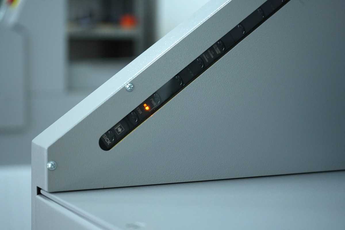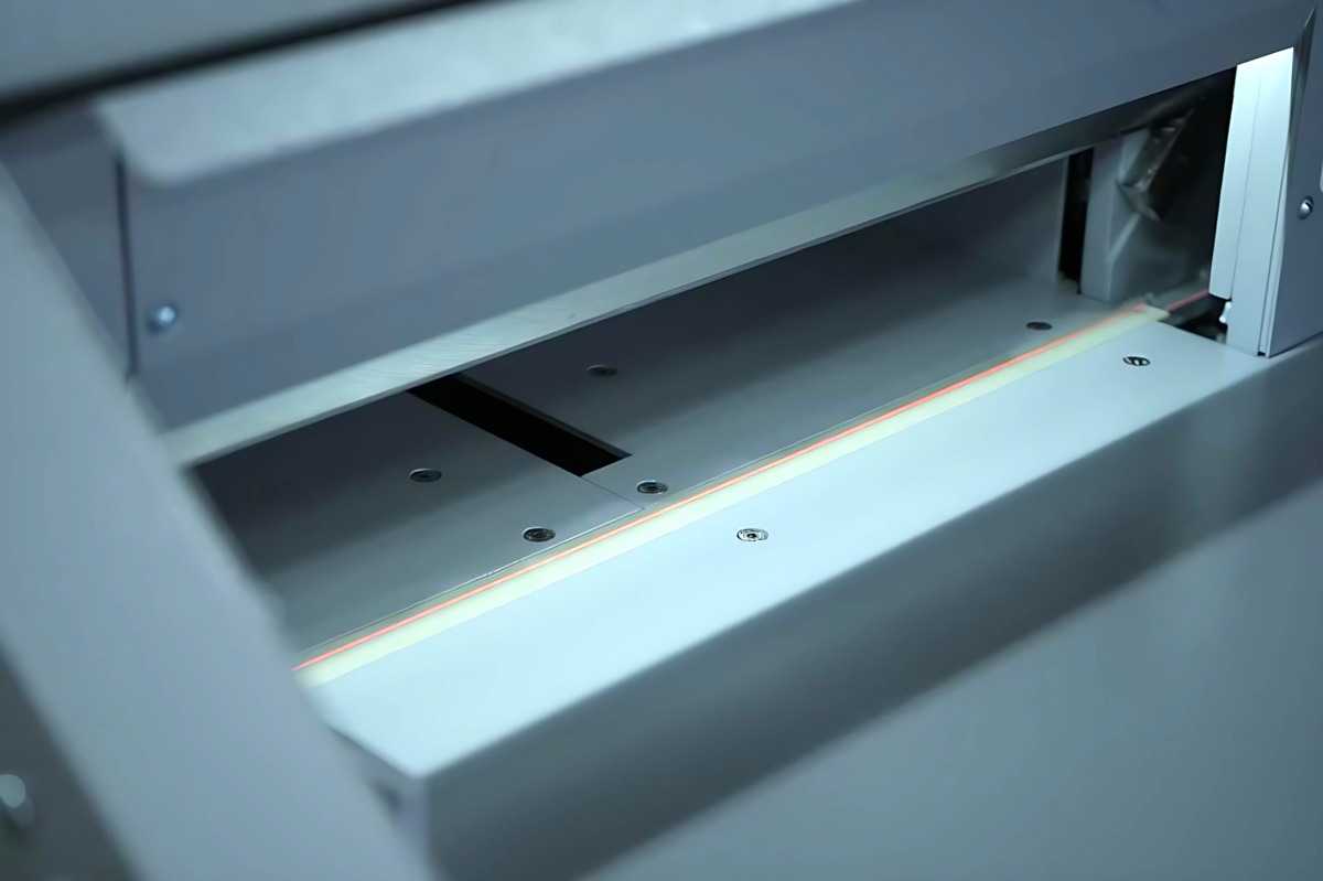 Stapelschneider mit elektrischem Messer- und Pressbalken-Antrieb. Touch-Screen-Programmsteuerung, Lichtschranken und