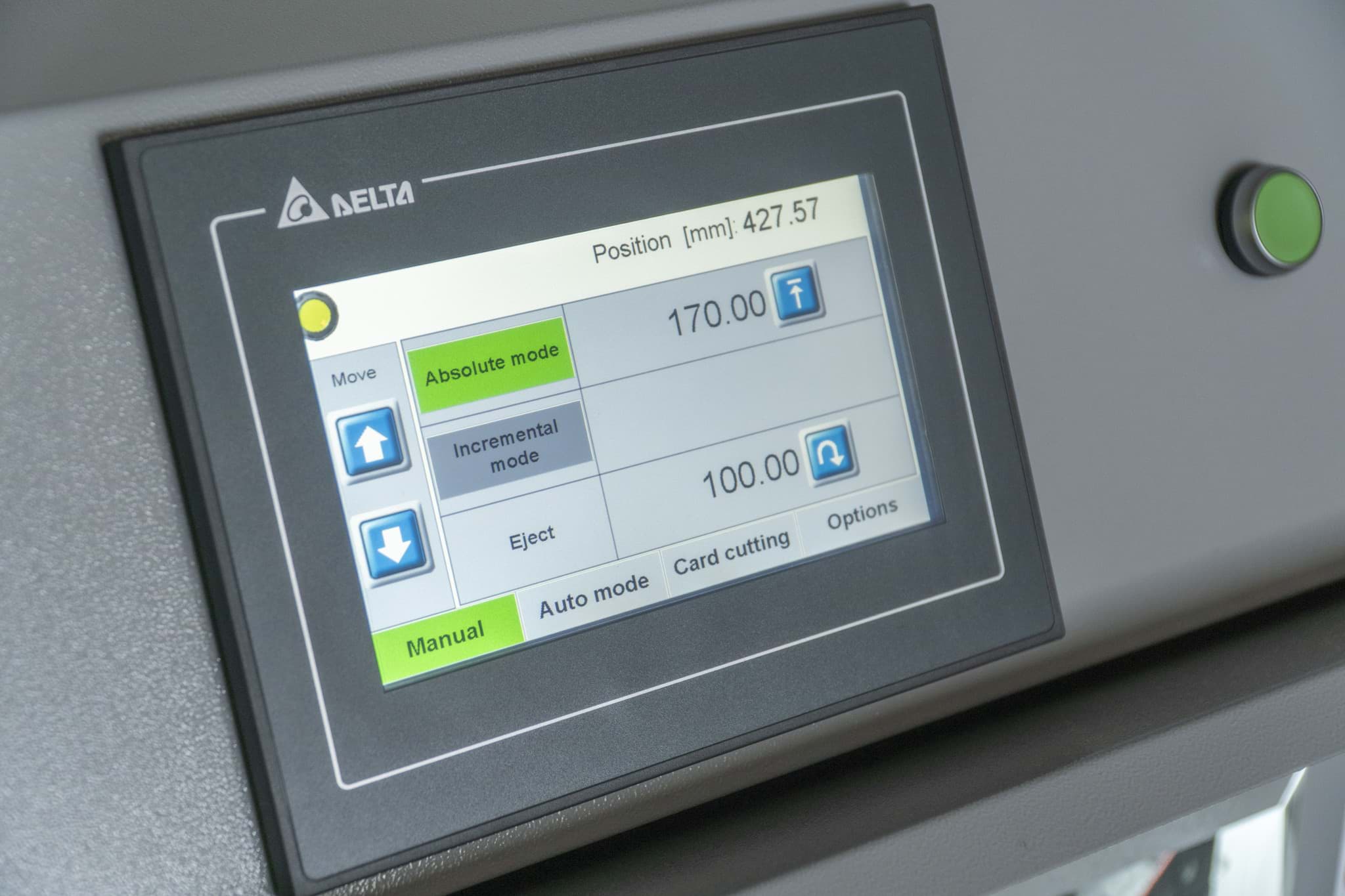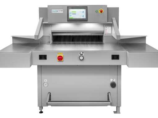 Professioneller Stapelschneider mit hydraulischem Messer- und Pressbalken-Antrieb. Touch-Screen-Programmsteuerung, Lichtschranken