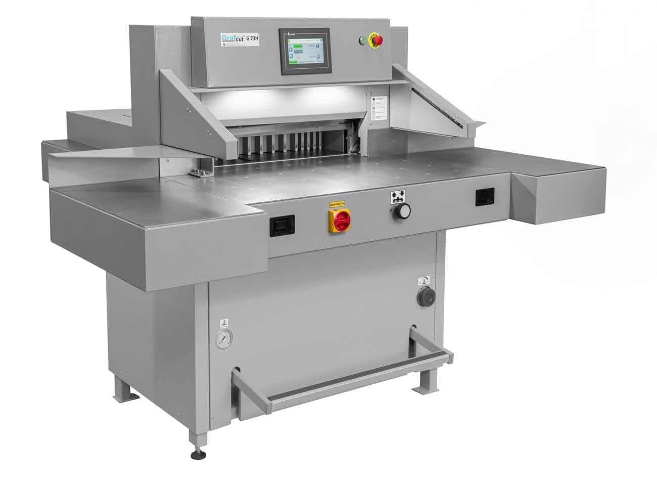 Komplettausstattung: Schnittbreite 73 cm, Stapelhöhe 10 cm, 2 Seitentische, grosser Touch-Screen, Laser-Schnittandeuter, Lichtschranken,